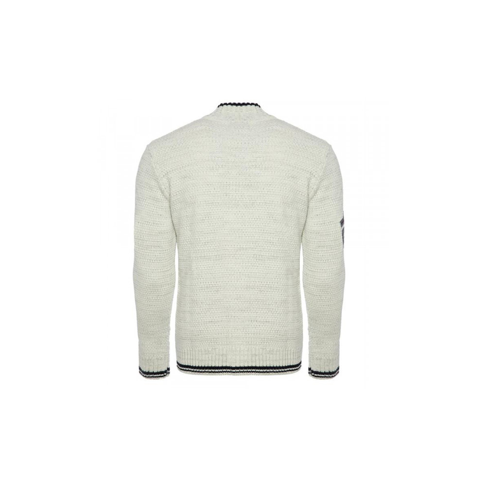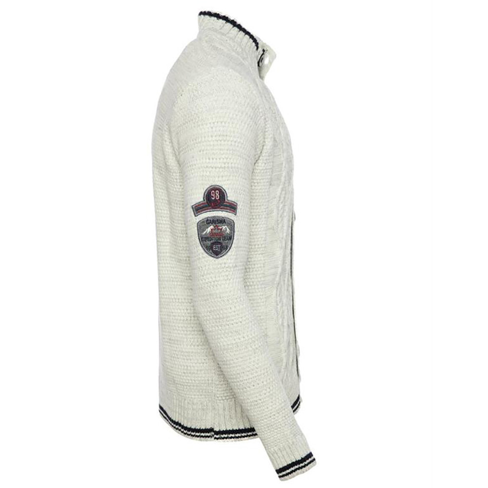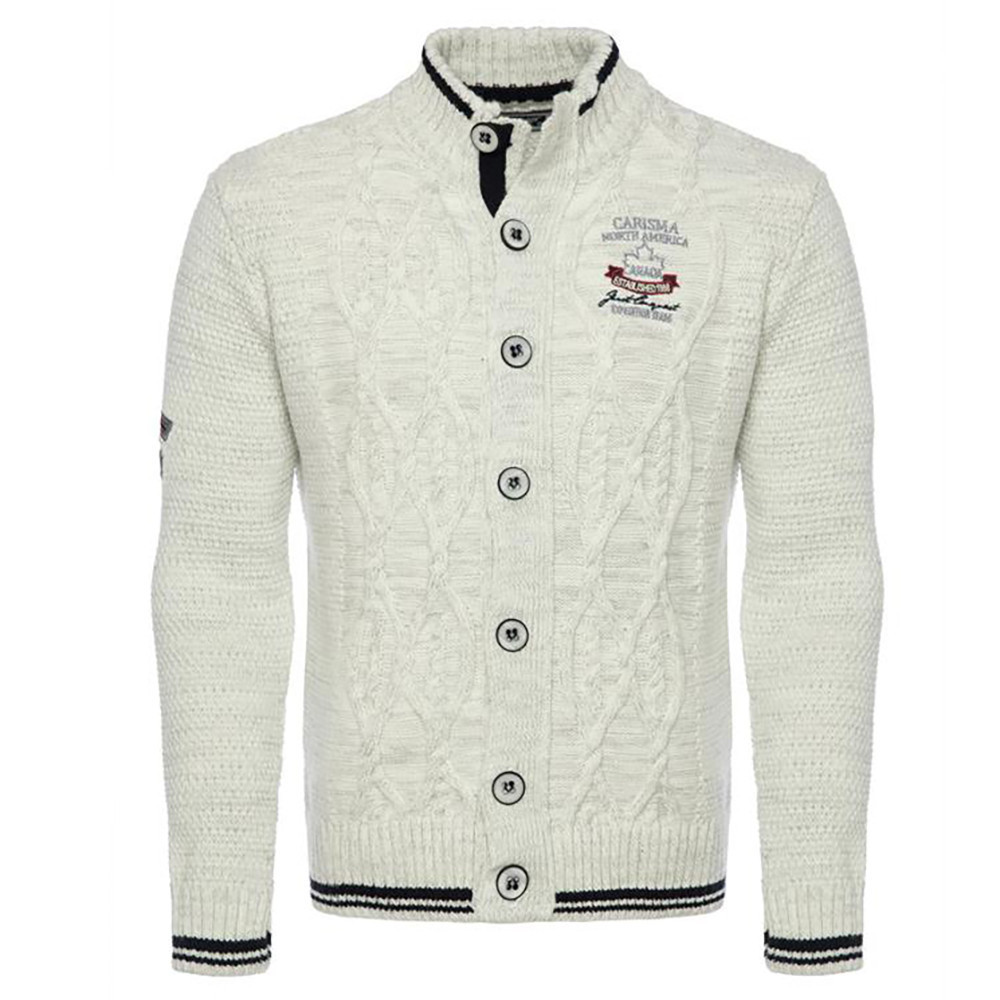 Moderní bílý svetr CARISMA s pleteným vzorem, logem a zapínáním na knoflíky.