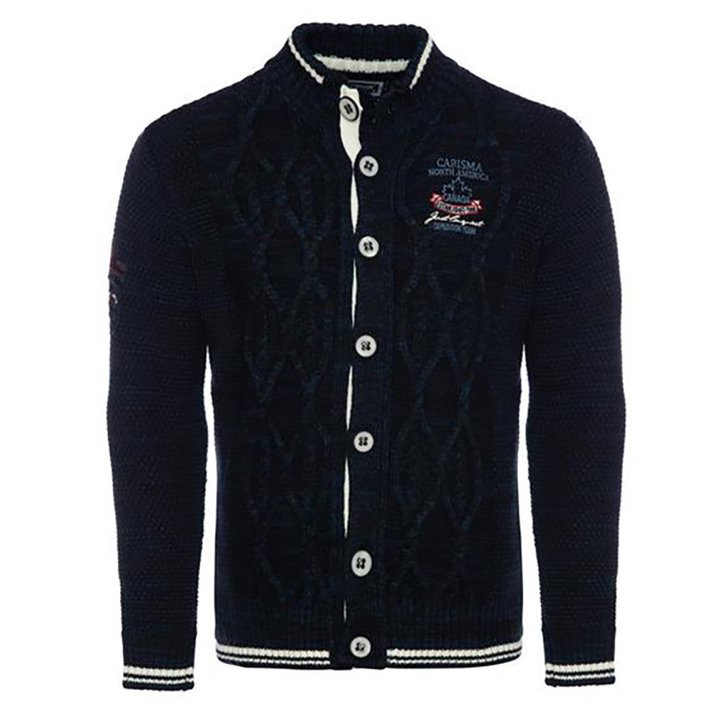 Tmavě modrý pánský svetr CARISMA s výrazným vzorem, knoflíky a logem.