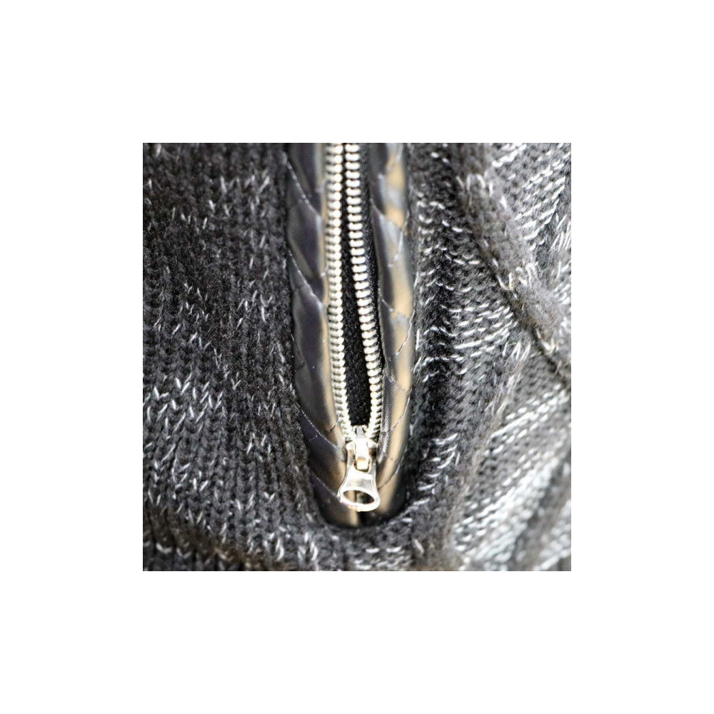 Detaily z umělé kůže na ramenou a prsou dodávají svetru jedinečný vzhled.