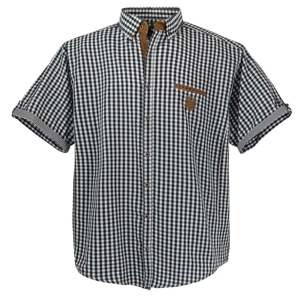 Košeľa s krátkym rukávom v nadmerných veľkostiach 3 - 7XL. Košeľa je vyrobená 90% bavlna, 10% polyester a je strihu regular fit. Košeľa okraj rukávov v inom vzore. Vnútro légii je v hnedej farbe. Na hrudi je logo firmy.