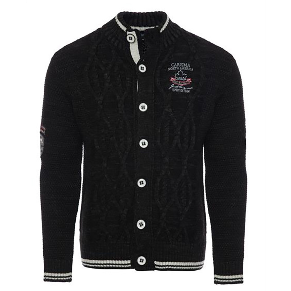 Štýlový čierny sveter CARISMA na gombíky s výrazným logom a moderným vzorom.