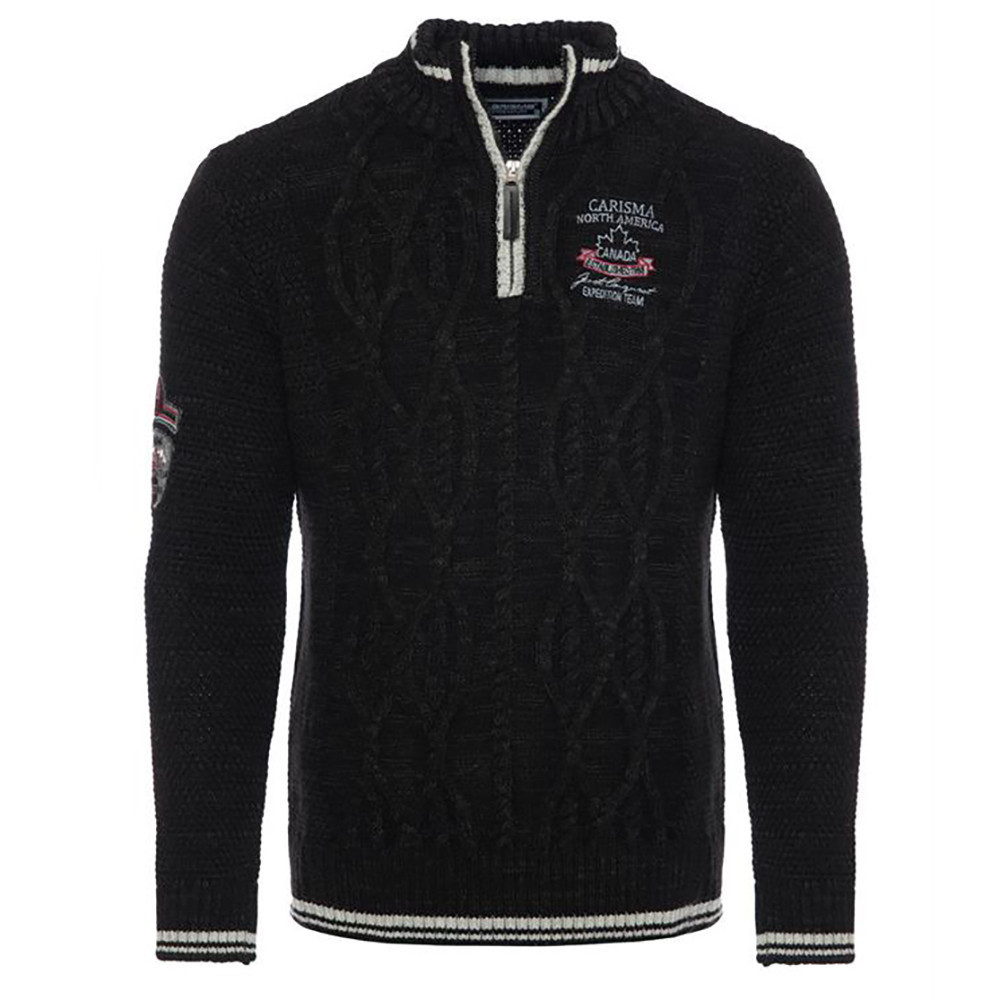 Moderný pánsky sveter CARISMA 7804 v čiernej farbe s pleteným vzorom a výstrihom do V na zips.