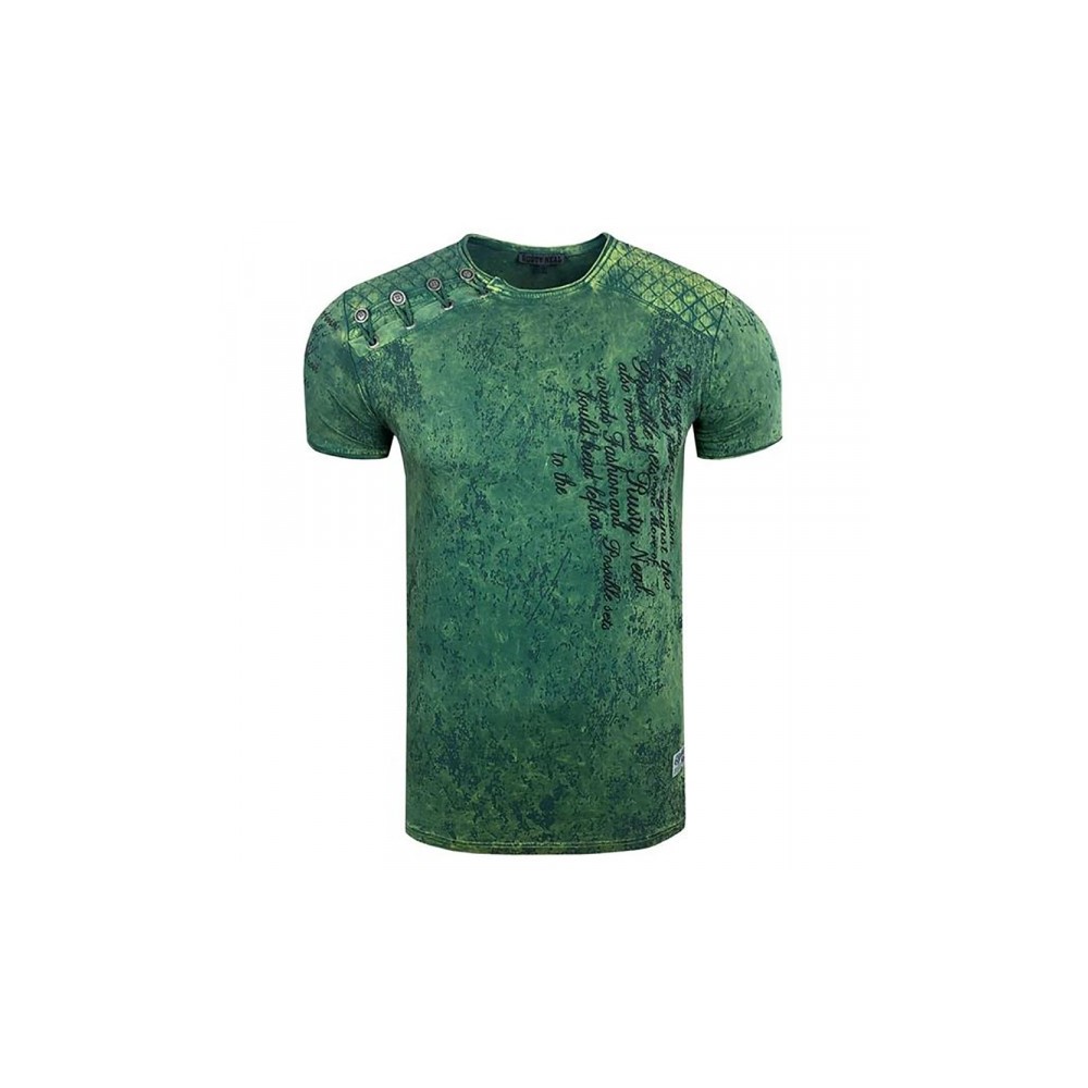 Zelené pánske tričko RUSTY NEAL 15195 prináša kombináciu výrazného „stone wash“ vzhľadu a moderných detailov, ako sú diagonálny nápis, prešívanie na ramene a kovové očká.
