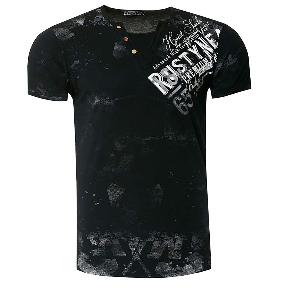 Pánske tričko Rusty Neal v čiernej farbe s originálnou potlačou a výstrihom na gombíky.