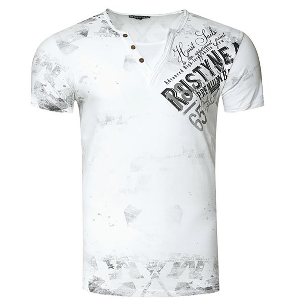 Pánske tričko Rusty Neal v bielej farbe s originálnou potlačou a výstrihom na gombíky.